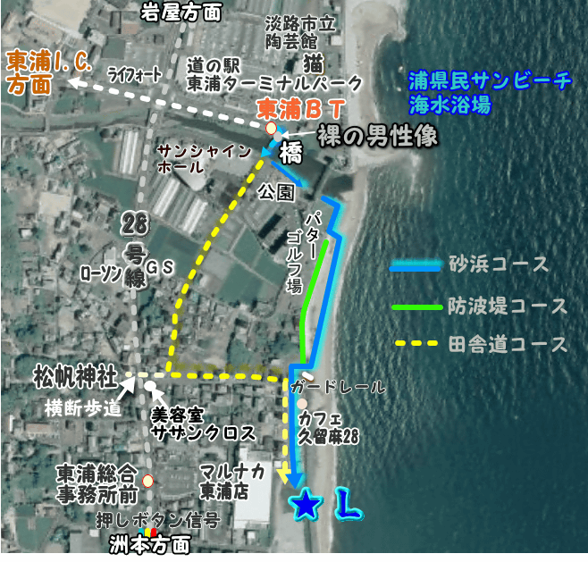 ★砂浜・防波堤コース 地図内の青の実線 *このコースは、雨の日は水たまりだらけになるので、長靴でないと歩けません。 1.東浦BTの斜め向かいにある銅像の横の小さな橋を渡る。 ![]() 2. 橋を渡ってすぐ左に曲がり道なりに進むと、防波堤沿いの道に出る。 ![]() 3. 防波堤の開口から砂浜へ出る。 砂浜は苦手という方は、そのまま防波堤の内側を歩いてこれます。 (地図内の緑の実践) ![]() 防波堤から出ると、東浦の海が広がります。 ![]() ★ L は砂浜の一番向こう端です。 最初の防波堤開口部から離れているので、建物は見えません。 歩いているうちに、徐々に緑色の屋根が見えてきます。 ![]() 4. 少し手前の、白いガードレールのところから、防波堤内へ戻ります。 ここが防波堤最後の開口部です。 ![]() 5. 防波堤内へ入って左手の家を 1軒通りすぎ、左へ曲がります。 カフェ久留麻28のある通りを進みます。 左手 7、8軒目、正面玄関に 9段の階段がある緑の屋根が ★ L ですが 他の建物で隠れているので、近くまでこないと見えません。 ![]() * 現在は、防波堤内に入らなくても、 砂浜をずーっと歩いて ★ L まで来ることもできます。 ★ L の目印は、緑色の屋根です。 防波堤の斜面を上がると、反対側に階段がありますので、 そこから下りてください。 ![]() ![]() 手すりが流木でできている階段を下り、 前に見える道路のほうへ進むと、右手に玄関があります。 (階段を下りたところは ★ L の敷地内です) ![]() ![]() (この階段は↑旦那さんが作ってくれました) ★田舎道コース 地図内の黄色の点線 畑と民家が点在する、のどかな田舎の風情溢れる道路です。 1. 裸の男性の銅像そばの小さな橋を渡り、突き当りまで直進します。 ![]() ![]() ![]() ![]() 2. 突き当りを左に曲がり、直進すると、防波堤に突き当たるので、 その手前の道を右に曲がり、直進します。 3. カフェ久留麻28のある通りを進みます。 左手 7、8軒目、正面玄関に 9段の階段がある緑の屋根が ★ L ですが、 他の建物で隠れているので、近くまでこないと見えません。 ![]() *ちょっと寄り道するなら、↓松帆神社がお薦めです。 上記コース 2.の突き当りで、反対の右側に曲がると、すぐ松帆神社があります。 広々と奥行きのある境内がいつも清々しい神社です。 少し寄り道して、参拝などいかがでしょう。 ![]() ![]() ★近隣の駐車場 ★ L にも駐車場はございますが、 マルナカでお買い物される場合は、そちらの無料駐車場もご利用可能です。 また、道の駅・東浦ターミナルパークにも無料駐車場があり、 パーク内には郷土の物産品を取り揃えたお店が数軒あります。 ぜひこちらでのお買い物も楽しんでいただいて、 海辺の散策をお楽しみくださいませ。 ![]() |